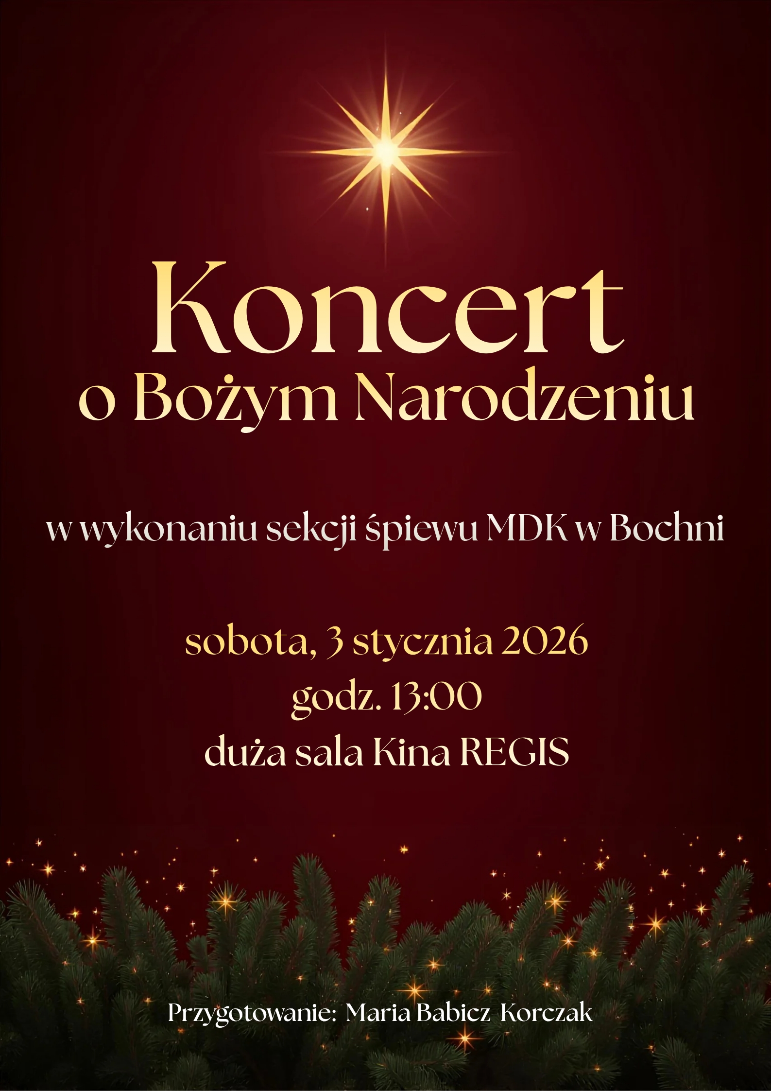 gru 31, 2025 Posted by: Aleksandra Fortuna-Nieć Aktualności Koncert o Bożym Narodzeniu Koncert o Bożym Narodzeniu w wykonaniu podopiecznych sekcji śpiewu MDK w Bochni przygotowanych przez Marię Babicz-Korczak odbędzie się w sobotę 3 stycznia 2026 roku o godzinie 13.00 w dużej sali kina Regis. Zapraszamy! Off 188