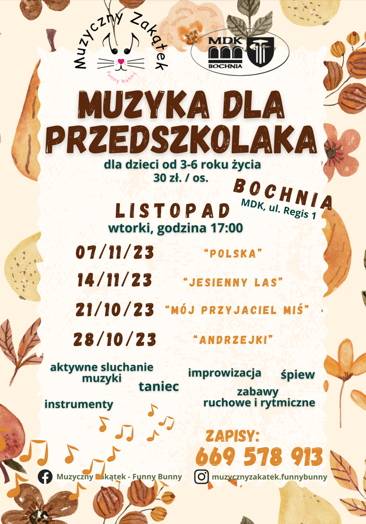 paź 24, 2023 Posted by: Aleksandra Fortuna-Nieć Aktualności Muzyka dla przedszkolaka – listopad Dzieci od 3. do 6. roku życia zapraszamy na muzyczne wtorki. Szczegóły w załączniku. Off 684