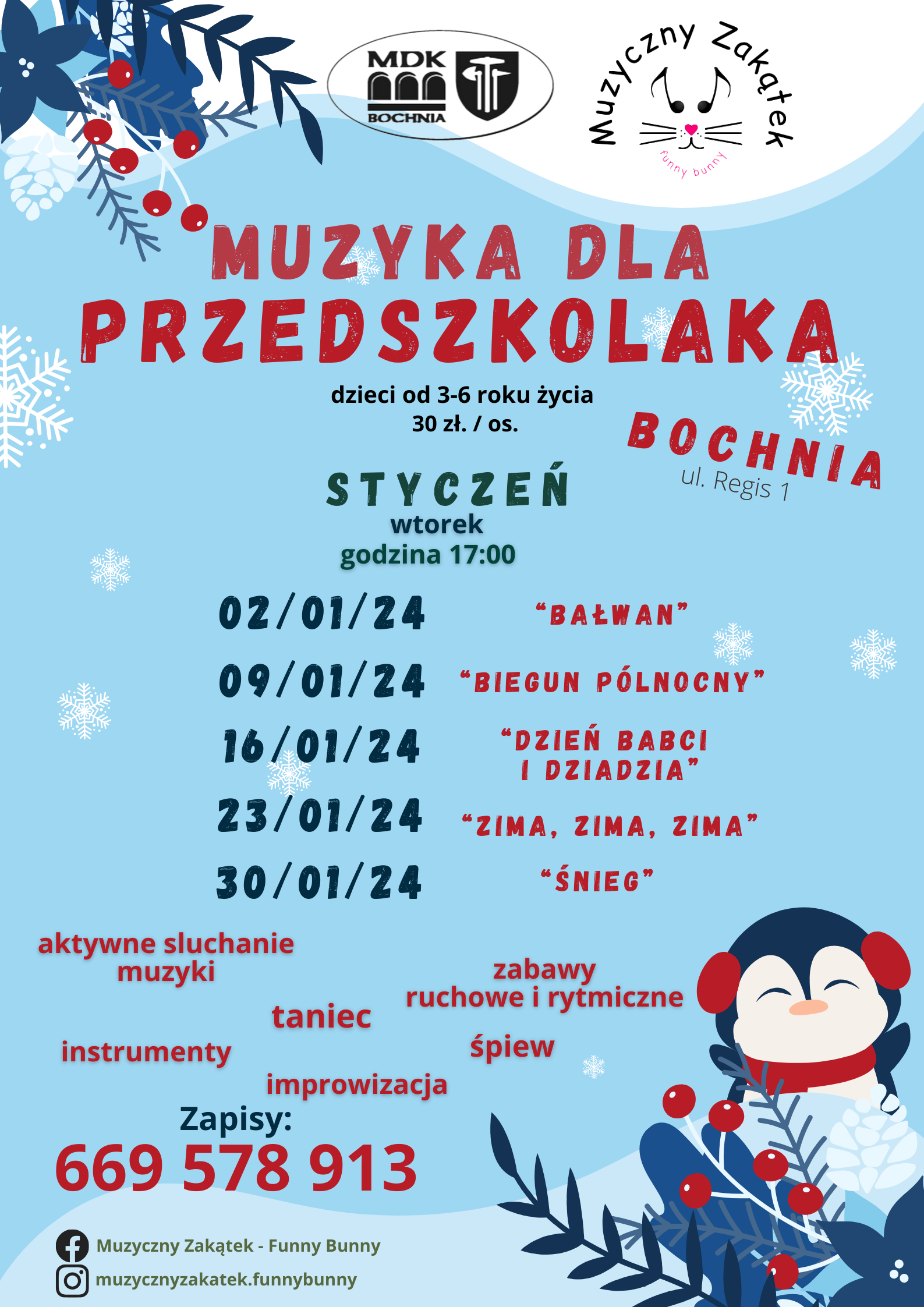 sty 03, 2024 Posted by: Karolina Aktualności Muzyka dla przedszkolaka – styczeń Dzieci od 3. do 6. roku życia zapraszamy na muzyczne wtorki. Off 596
