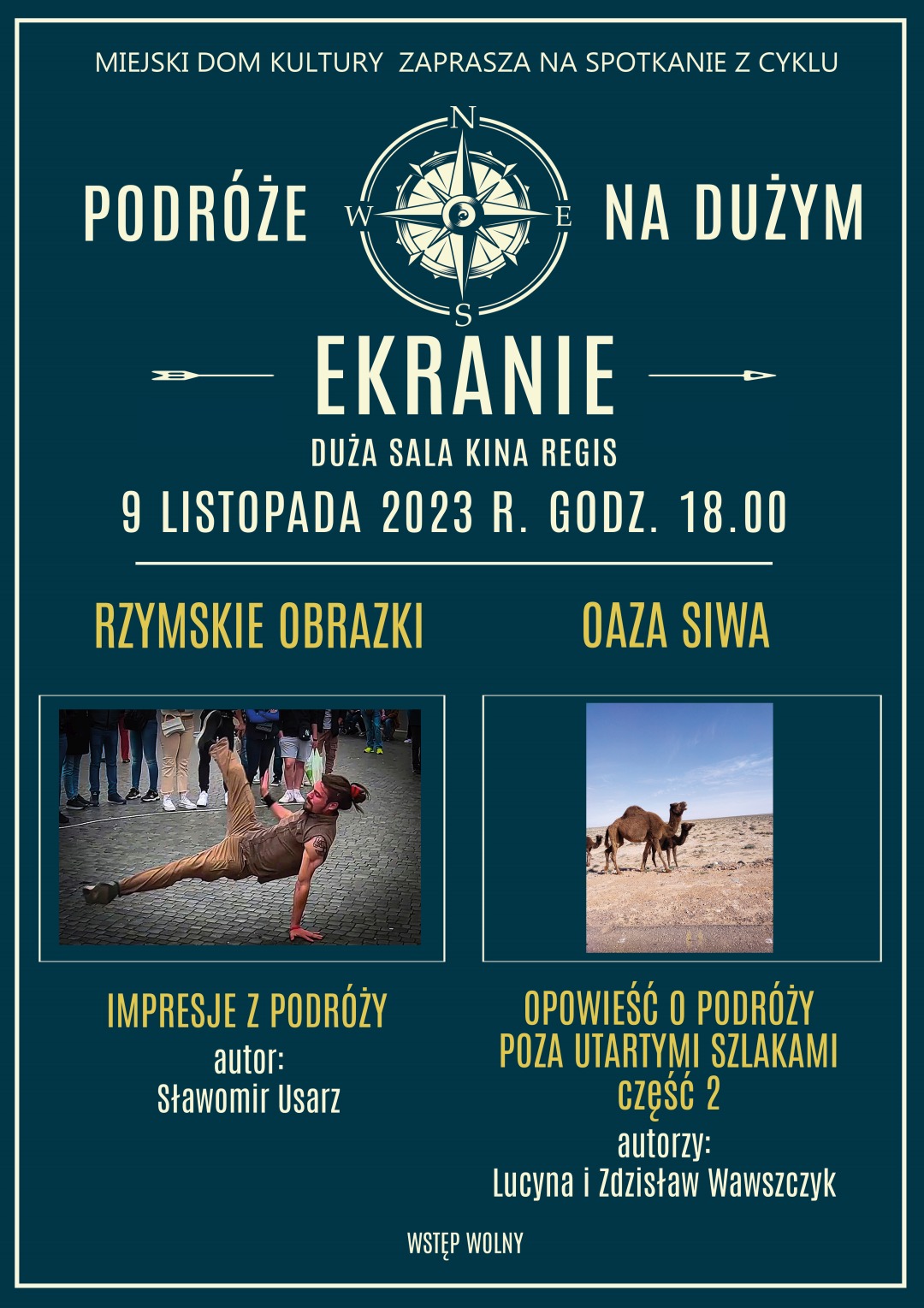 Tym razem będzie można obejrzeć obrazy dwojga a w zasadzie trojga autorów: debiutującego Sławomira Usarza „Rzymskie obrazki. Impresje z podróży” oraz znanego już „ekranowym podróżnikom” duetu Lucyny i Zdzisława Wawszczyków „Oaza Siwa. Opowieść o podróży poza utartymi szlakami”.