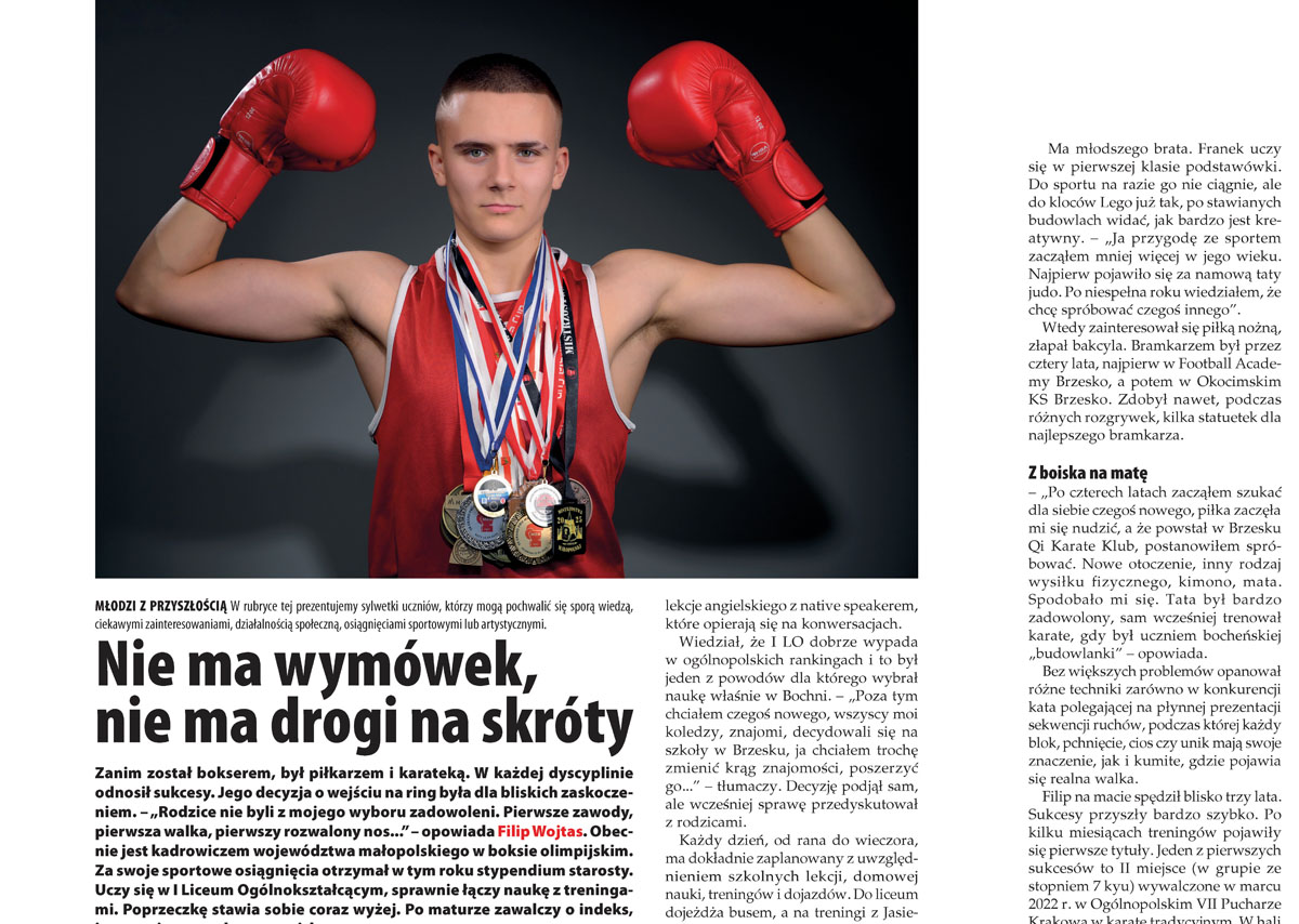 Zanim został bokserem, był piłkarzem i karateką. W każdej dyscyplinie odnosił sukcesy. Jego decyzja o wejściu na ring była dla bliskich zaskoczeniem. – „Rodzice nie byli z mojego wyboru zadowoleni. Pierwsze zawody, pierwsza walka, pierwszy rozwalony nos…” – opowiada Filip Wojtas, bohater cyklu „Młodzi z przyszłością”, uczeń I LO w Bochni. Obecnie jest kadrowiczem województwa małopolskiego w boksie olimpijskim.
