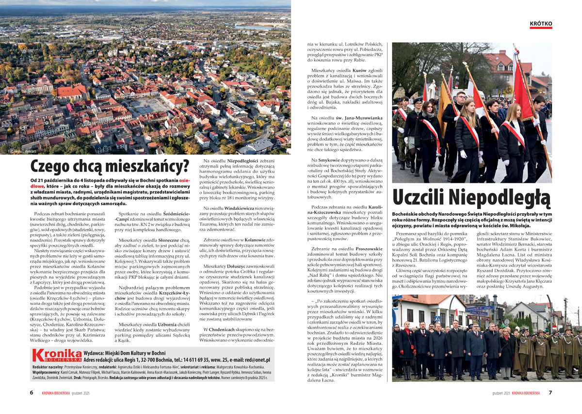 – „Czego chcą mieszkańcy” – od takiego pytania „Kronika” rozpoczyna dział „Krótko”. Spotkania osiedlowe jak co roku były dla mieszkańców okazją do rozmowy z władzami miasta i podzielenia się swoimi spostrzeżeniami. – „W kilku przypadkach udaliśmy się z radnymi i członkami zarządów osiedli w teren, by skonfrontować realia z oczekiwaniami bochnian” – komentuje w rozmowie z redakcją burmistrz Magdalena Łacna.