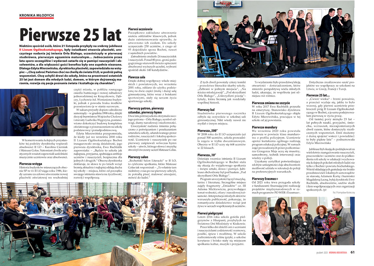– „Niektóre spośród osób, które 21 listopada przybyły na srebrny jubileusz II Liceum Ogólnokształcącego, były świadkami otwarcia placówki, uroczystego nadania jej imienia Orła Białego, uczestniczyły w pierwszej studniówce, pierwszym egzaminie maturalnym…” – zauważa „Kronika”.