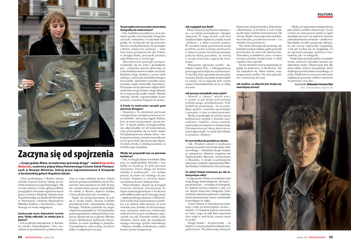 – „Czuję spokój. Wiem, że malarstwo jest moja drogą” – mówi Aleksandra Małyszek, uczennica piątej klasy Państwowego Liceum Sztuk Plastycznych w Nowym Wiśniczu, której prace zaprezentowano w bocheńskiej galerii Kopalnia Sztuki. Choć pochodząca z Bochni młoda artystka dopiero kończy szkołę, jej dorobek konkursowy jest imponujący, a 30 października, na Zamku Królewskim w Warszawie, odebrała Stypendium Ministra Kultury i Dziedzictwa Narodowego za swoje osiągnięcia.