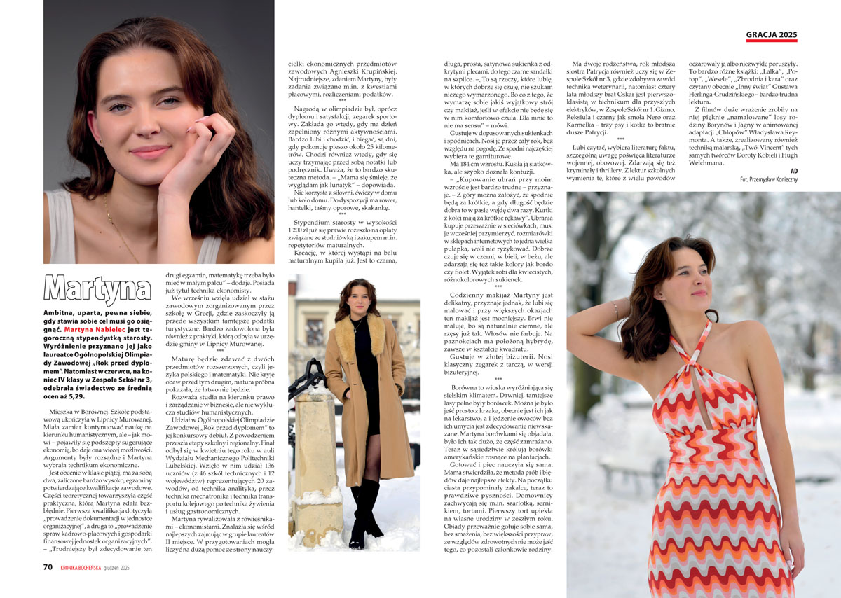 Martyna Nabielec, ostatnia w tym roku kandydatka do tytułu „Gracja Bocheńska”, jest stypendystką starosty. Wyróżnienie przyznano jej jako laureatce Ogólnopolskiej Olimpiady Zawodowej „Rok przed dyplomem”. Natomiast w czerwcu, na koniec IV klasy w Zespole Szkół nr 3, odebrała świadectwo ze średnią ocen aż 5,29.