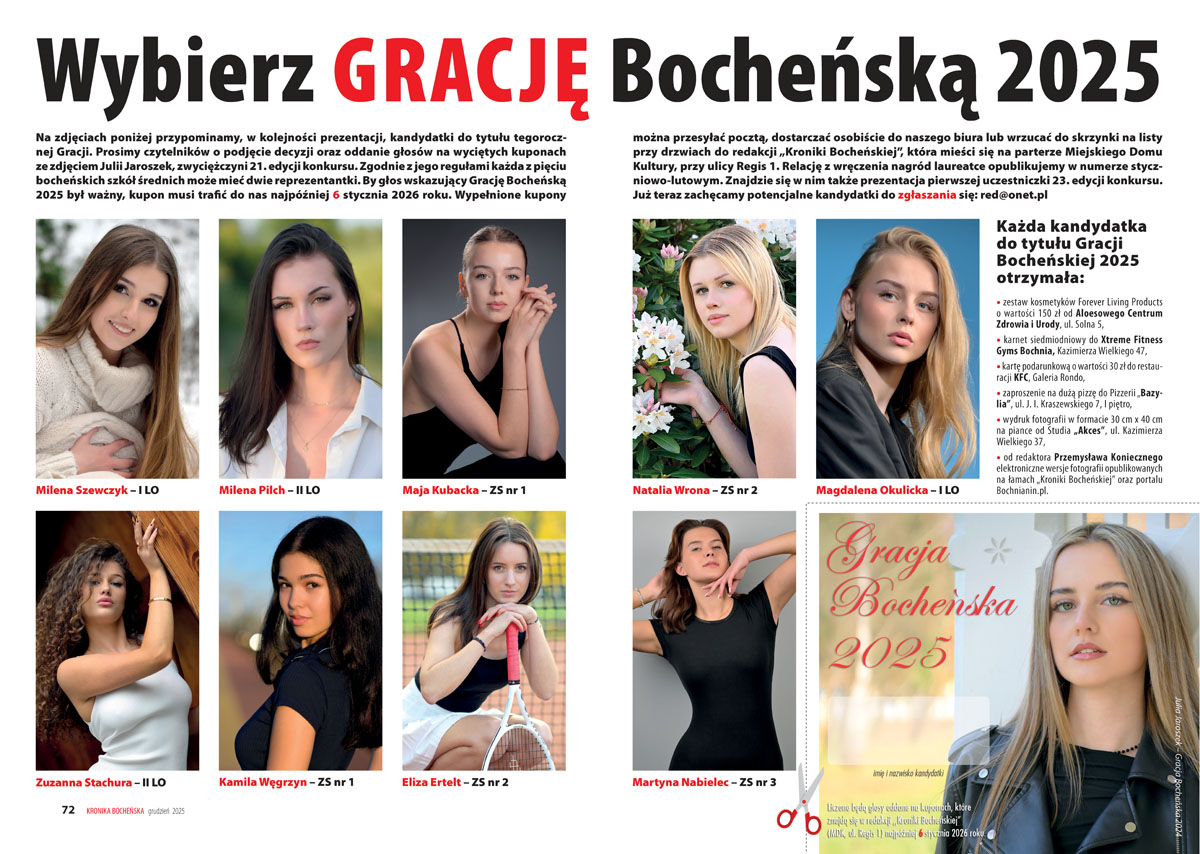 Dziewięć kandydatek i jeden kupon do głosowania ze zdjęciem Julii Jaroszek, zwyciężczyni 21. edycji konkursu. Kto otrzyma tytuł „Gracja Bocheńska 2025”? Liczone będą głosy, które znajdą się w redakcji „Kroniki Bocheńskiej” (MDK, ul. Regis 1) najpóźniej 6 stycznia 2026 roku.