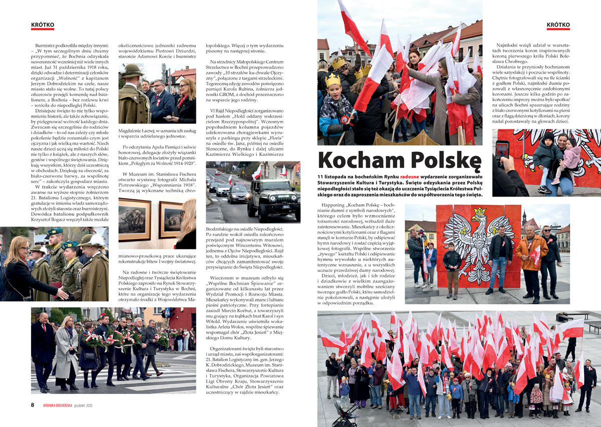 Nie brakowało chętnych do zdjęć na tle ścianki z godłem Polski, zwłaszcza że była to doskonała okazja, by zaprezentować własnoręcznie ozdobione korony. Okładka „Kroniki” upamiętnia to jedenastolistopadowe królewskie świętowanie. W grudniowym numerze przeczytać można dużo o sprawach wyjątkowo ważnych dla miasta. O nadchodzących inwestycjach w kopalni soli opowiada prezes Krzysztof Zięba, a o wyzwaniach, z jakimi mierzą się dzisiaj deweloperzy mówi Kazimierz Budek, twórca jednego z największych prywatnych przedsięwzięć mieszkaniowych w historii Bochni.