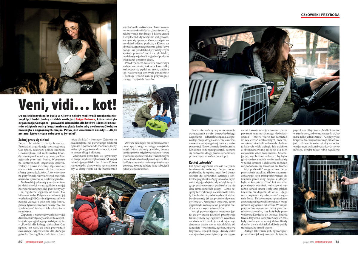 Jakub Konieczny, autor artykułu „Veni, vidi… kot!” w ten sposób rozpoczyna swój artykuł: – „Do największych zalet życia w Kijowie należy możliwość spotkania niezwykłych ludzi. Jedną z takich osób jest Petya Petrova, która założyła organizację Cat Space – prowadzi schronisko dla kotów i kóz z terenów objętych wojną i regularnie ryzykuje życie, aby ewakuować kolejne zwierzęta z zagrożonych miejsc”. Warto przeczytać tę historię od deski do deski.