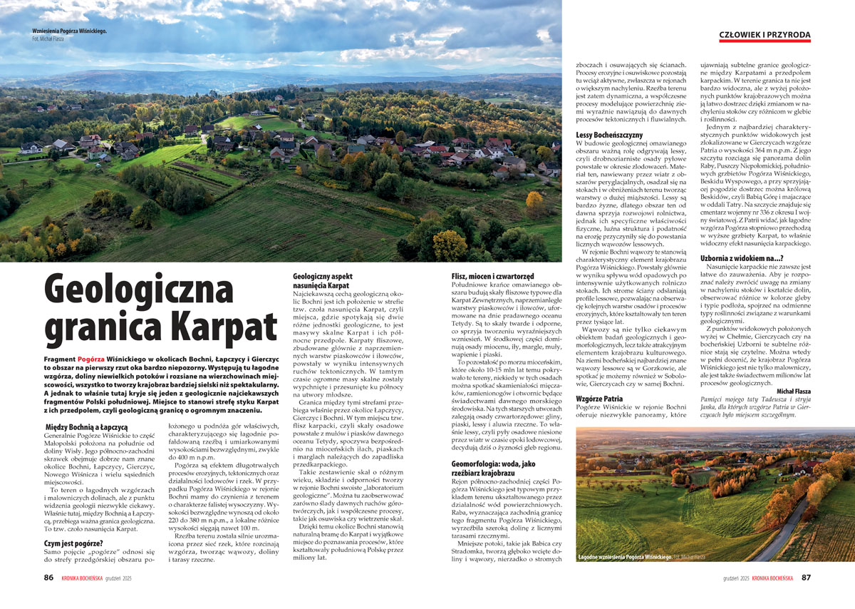 – „Pogórze Wiśnickie w rejonie Bochni oferuje niezwykłe panoramy, które ujawniają granice geologiczne między Karpatami a przedpolem karpackim” – zauważa geolog Michał Flasza. Czytelników zaprasza między innymi na zlokalizowane w Gierczycach wzgórze Patria o wysokości 364 m n.p.m. Przy sprzyjającej pogodzie można dostrzec stamtąd nawet Babią Górę i majaczące w oddali Tatry.