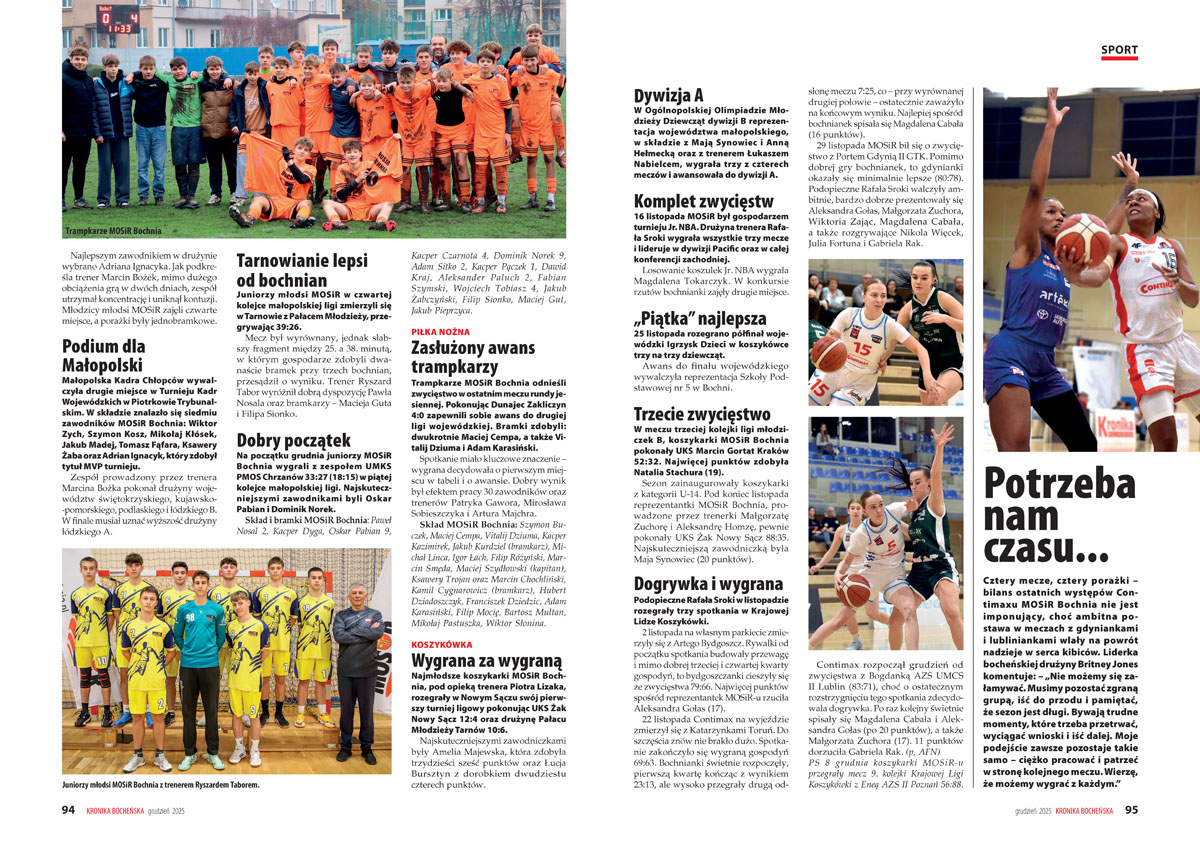Bilans ostatnich występów Contimaxu MOSiR Bochnia nie jest imponujący, choć ambitna postawa w meczach z gdyniankami i lubliniankami wlały na powrót nadzieje w serca kibiców basketu. Liderka drużyny Britney Jones komentuje na łamach „Kroniki”: – „Nie możemy się załamywać. Musimy pozostać zgraną grupą, iść do przodu i pamiętać, że sezon jest długi”. Koszykówka to jedna z wielu dyscyplin sportu, o których pisze „Kronika”. Nie brakuje informacji o sukcesach młodych sportowców trenujących w MOSiR Bochnia.
