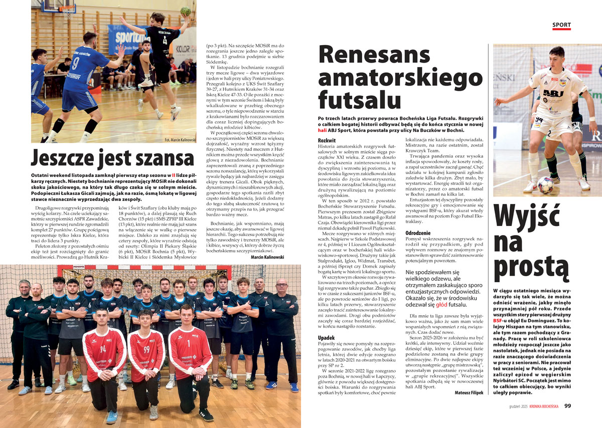 Ostatni weekend listopada zamknął pierwszy etap sezonu w II lidze piłkarzy ręcznych. Marcin Kalinowski ocenia: – „Niestety bochnianie reprezentujący MOSiR nie dokonali skoku jakościowego, na który tak długo czeka się w solnym mieście. Podopieczni Łukasza Gicali zajmują, jak na razie, ósmą lokatę w ligowej stawce, nieznacznie wyprzedzając dwa zespoły”.