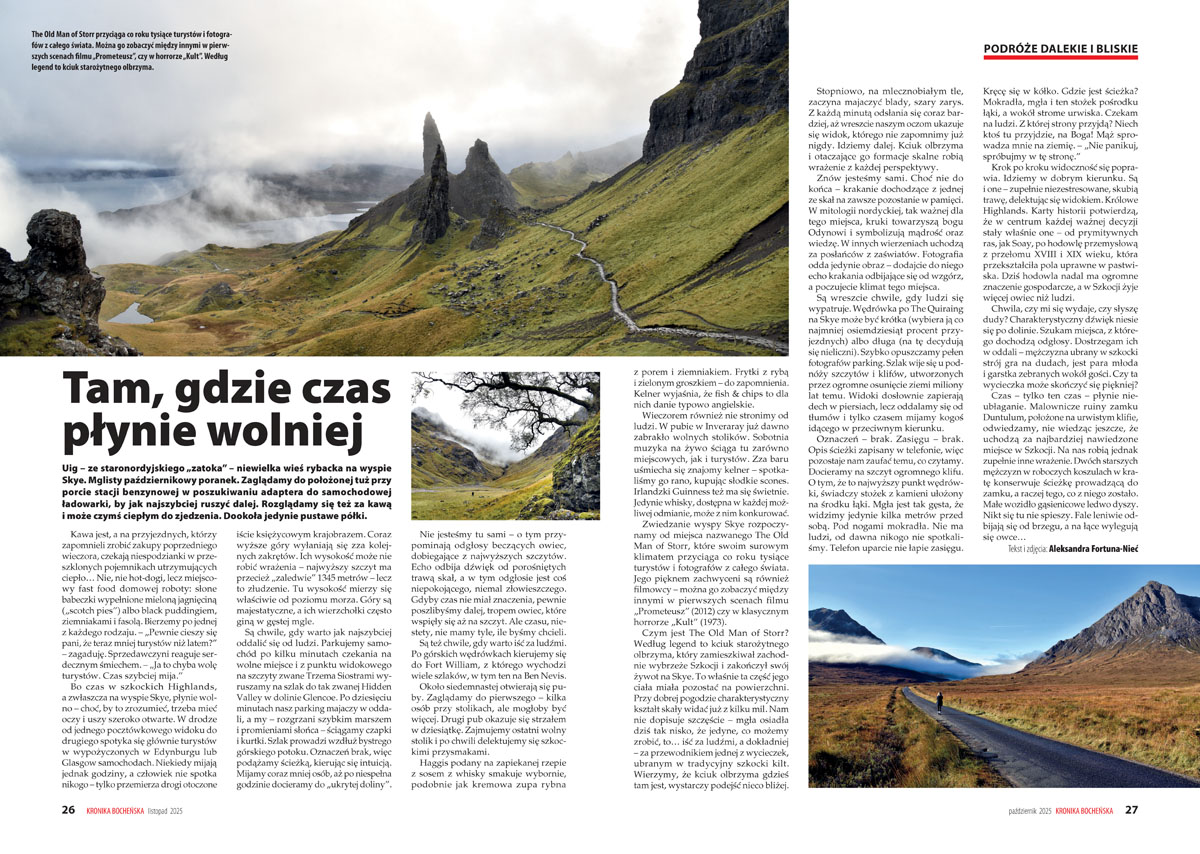 Na wyprawę do Szkocji zaprasza czytelników Aleksandra Fortuna-Nieć. – „Nie jesteśmy tu sami – o tym przypominają odgłosy beczących owiec, dobiegające z najwyższych szczytów. Czy to przywitanie? Jak one się tam dostały? Echo odbija dźwięk od porośniętych trawą skał, a w tym odgłosie jest coś niepokojącego, niemal złowieszczego. Gdyby czas nie miał znaczenia, pewnie poszlibyśmy dalej, tropem owiec, które wspięły się aż na szczyt” – tak autorka relacjonuje jedną z wycieczek w dolinie Glencoe.