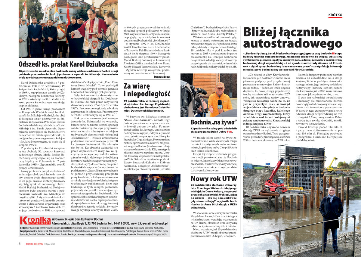 Dział „Krótko” rozpoczyna smutna informacja o śmierci kapłana doskonale znanego wielu mieszkańcom Bochni z racji pełnienia przez osiem lat funkcji proboszcza w parafii św. Mikołaja. – „To za jego czasów zintensyfikowały się pielgrzymki do cudownego obrazu Matki Boskiej Bocheńskiej. Kolejnym krokiem było podjęcie starań o podniesienie kościoła św. Mikołaja do rangi bazyliki” – czytamy.