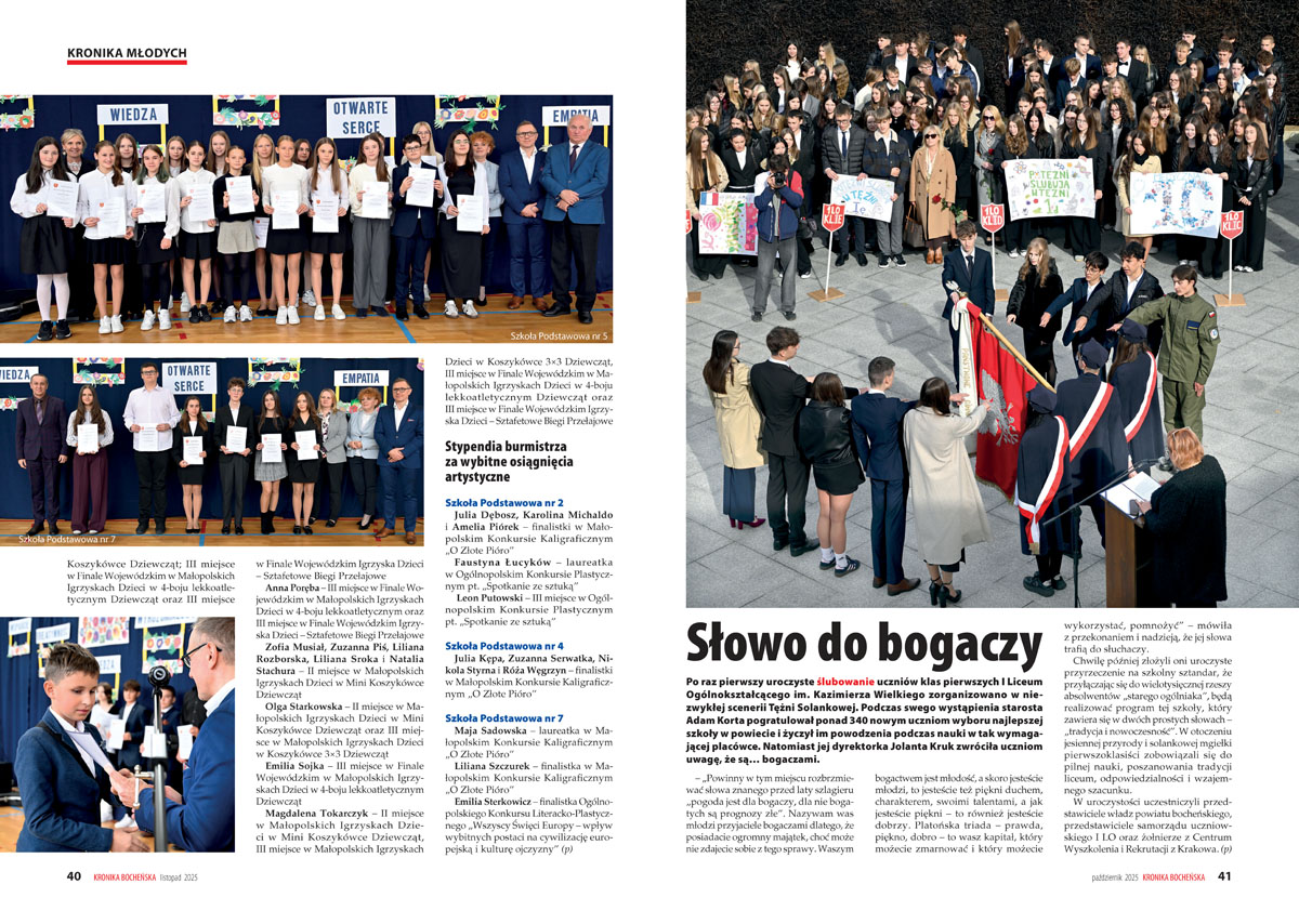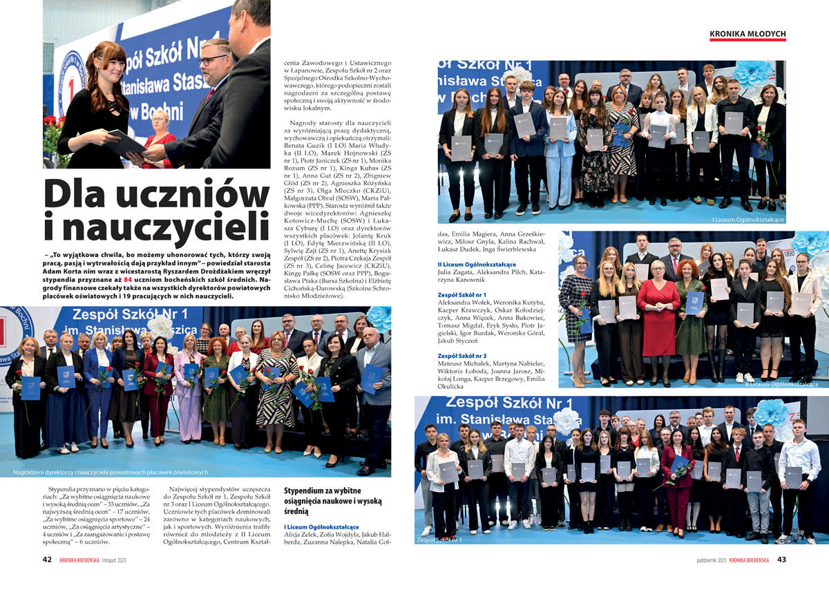 – „To wyjątkowa chwila, bo możemy uhonorować tych, którzy swoją pracą, pasją i wytrwałością dają przykład innych” – powiedział starosta Adam Korta nim wraz z wicestarostą Ryszardem Drożdżakiem wręczył stypendia przyznane aż 84 uczniom bocheńskich szkół średnich. „Kronika” publikuje imiona i nazwiska, a także zdjęcia z tej uroczystości.