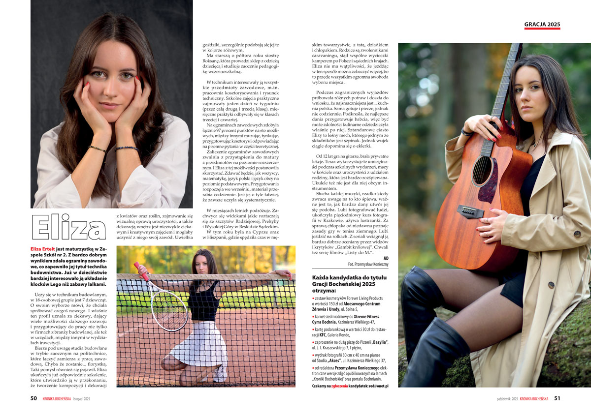 Eliza Ertelt, listopadowa kandydatka do tytułu „Gracji Bocheńskiej”, jest maturzystką w Zespole Szkół nr 2. Z bardzo dobrym wynikiem zdała egzaminy zawodowe, co zapewniło jej tytuł technika budownictwa. Już w dzieciństwie bardziej interesowało ją układanie klocków Lego niż zabawy lalkami, ale budownictwo to nie jedyne jej zainteresowanie. Od dwunastu lat gra na gitarze.