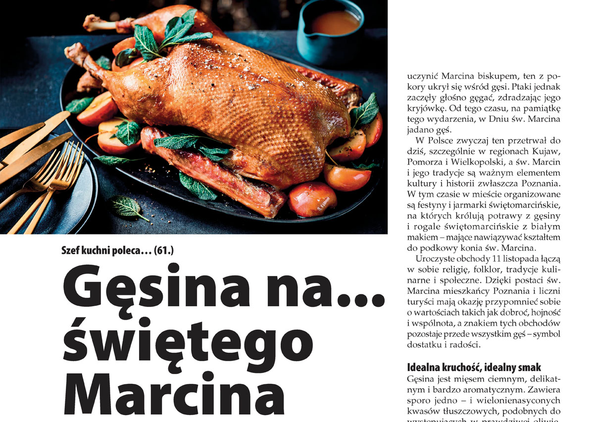 W ocenie Rafała E. Stolarskiego to jedno z najbardziej tradycyjnych i cenionych mięs w polskiej kuchni. Od wieków gości na stołach w okresie jesienno-zimowym, a zwłaszcza w dniu świętego Marcina, który przypada na 11 listopada. Dawniej uważano ją za symbol dobrobytu i świątecznego ucztowania. Sprawdzone przepisy na gęsinę podaje autor cyklu „Szef kuchni poleca…”