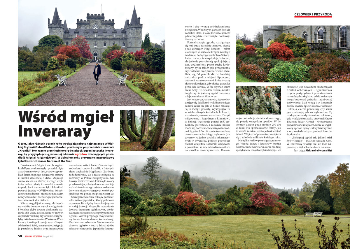 O tym, jak o różnych porach roku wyglądają rabaty najstarszego w Wielkiej Brytanii Oxford Botanic Garden można było przeczytać w poprzednich numerach „Kroniki”. Tym razem dzięki pełnemu fotografii artykułowi przenosimy się do szkockiego miasteczka Inveraray, by przyglądnąć się jesiennej odsłonie ogrodów otaczających posiadłość księcia i księżnej Argyll. W 2024 roku przyznano im prestiżowy tytuł Historic Houses Garden of the Year.