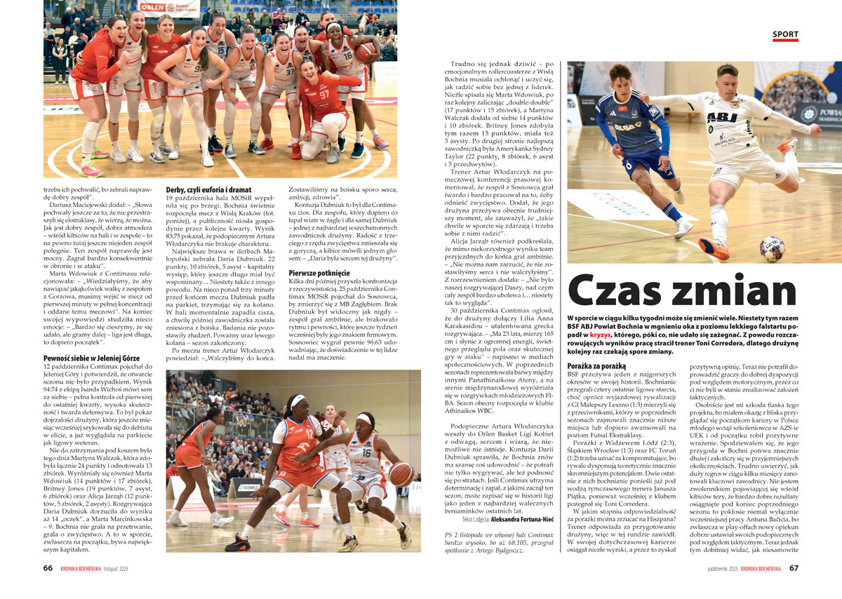 – „Debiut w Orlen Basket Lidze Kobiet to próba charakteru. Beniaminek z Małopolski wdarł się do elity z przytupem, wygrał trzy z czterech pierwszych spotkań, zyskał sympatię kibiców w całym kraju, ale też boleśnie przekonał się o tym, jak kruche bywa sportowe szczęście” – tak „Kronika” otwiera tekst o poczynaniach ekstraklasowych koszykarek Contimaxu. Nie brakuje zdjęć i ciekawych wniosków.
