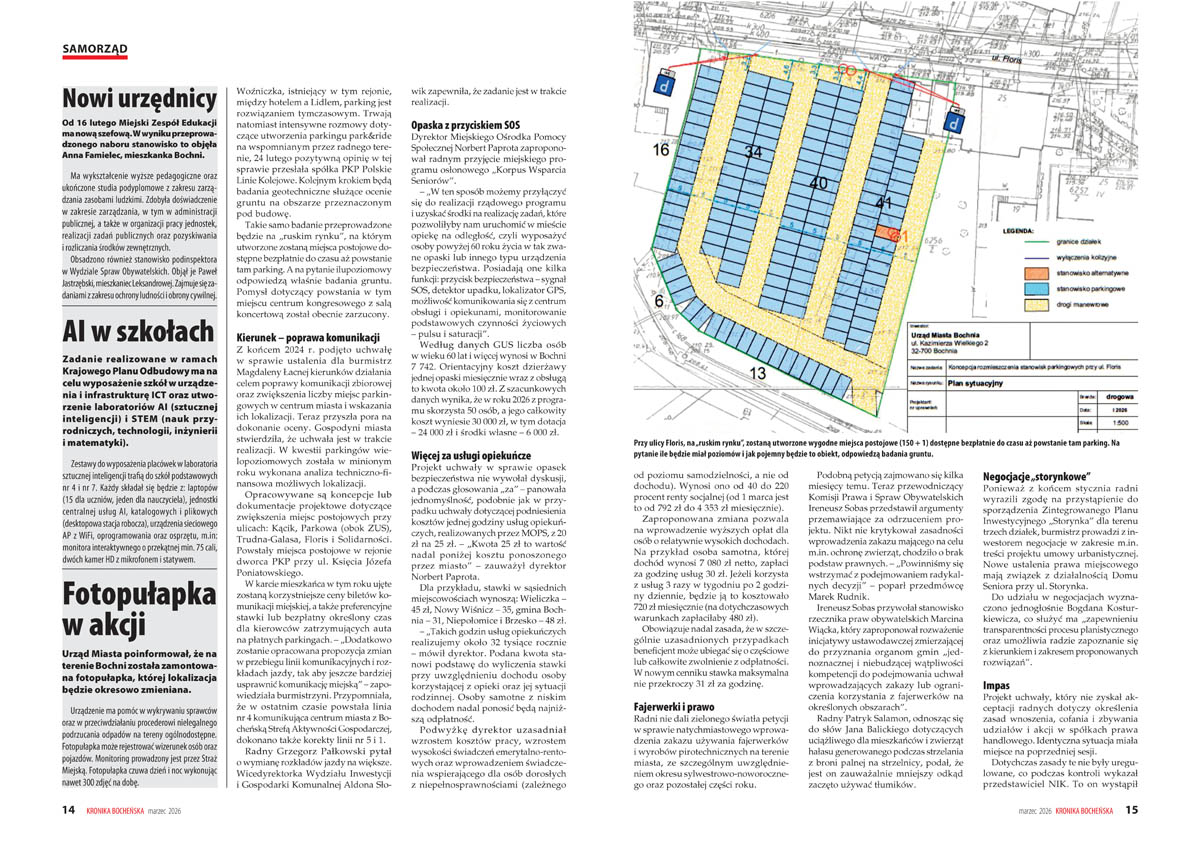 – „Dyskusja na temat karty mieszkańca splotła się na lutowej sesji z dyskusją na temat komunikacji publicznej, miejskich parkingów i miejsc postojowych. Wiadomo już, że karta stała się przedmiotem pożądania (w pierwszych trzech tygodniach od jej wprowadzenia starania o nią rozpoczęło ponad tysiąc Bochnian i Bochnianek) i że w najbliższych miesiącach w centrum miasta – na tzw. ruskim rynku oraz przy ul. Parkowej utworzonych zostanie ponad 100 dodatkowych miejsc postojowych, a to nie wszystko” – rozpoczyna relację z sesji Agnieszka Dziki. Ne brakuje ciekawostek. Jedną z nich jest informacja o tym, że do szkół podstawowych nr 4 i 7 trafią wkrótce zestawy do laboratoriów… sztucznej inteligencji.