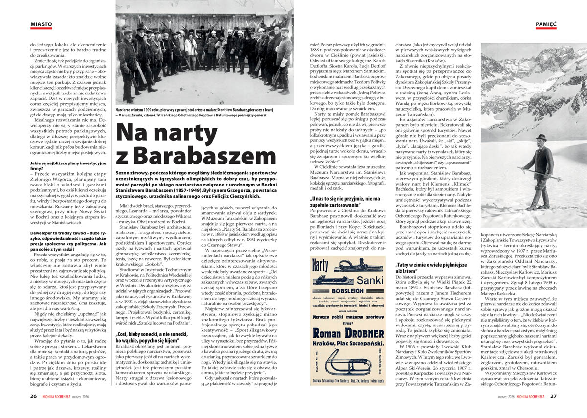 Początki polskiego narciarstwa związane z urodzonym w Bochni Stanisławem Barabaszem (1857-1949) przypomina Justyna Bodurka. W Zakopanem naszemu rodakowi ufundowano brązową tablicę. Samorząd bocheński także upamiętnił „pierwszego narciarza” nadając jego imię jednej z ulic. Niestety wywołało to… ostry sprzeciw. – „Szkoda, że część protestujących mieszkańców dzisiejszej ulicy Leśnej nie wiedziała o tej postaci nic więcej, poza tym, że brzmienie nazwiska było identyczne jak imię biblijnego złoczyńcy. W następstwie protestu jakże adekwatną dla Bochni nazwę zmieniono” – ubolewał wówczas na łamach „Kroniki” Jan Flasza.