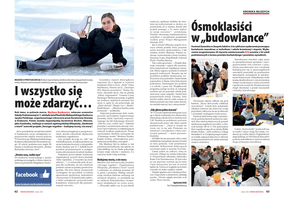 Jedno z najczęstszych pytań, jakie słyszy Aleksander Kropidłowski, reżyser z Bochni, brzmi: czy sztuczna inteligencja zabierze twórcom pracę? Jego odpowiedź jest spokojna i stanowcza. – „Dla mnie to jest narzędzie. Narzędzie, nad którym mam specyficzną kontrolę. Niepełną, ale wciąż bardzo dużą i bardzo kreatywną”. Marcowy numer „Kroniki” zainteresuje maturzystów – młodzież „mechanika” prezentuje się na klasowych, a uczennice i uczniowie I i II LO na fotografiach ze studniówek. Uwagę miłośników lokalnej historii zapewne przyciągnie artykuł „Archipelag agentów”, podróży – reportaż z otwierającej oczy wyprawy do Nepalu, a przyrodników – analiza występowania różnych gatunków sów w Bochni.