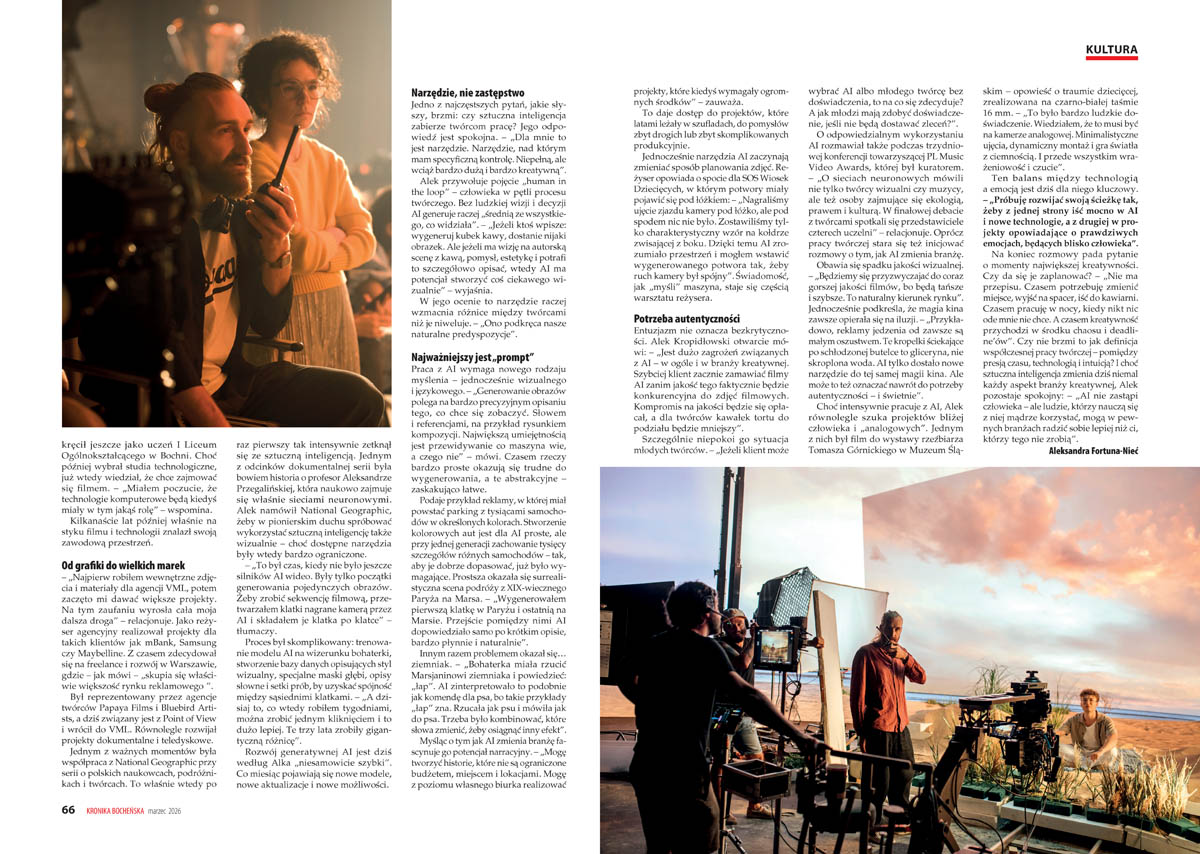 Kiedy pochodzący z Bochni Alek Kropidłowski opowiada o swojej pracy, szybko pojawiają się dwa tematy: film i sztuczna inteligencja. O AI nie mówi jednak jak o technologicznej sensacji ani zagrożeniu dla twórców. Raczej jak o kolejnym narzędziu pracy – trochę nieprzewidywalnym, czasem frustrującym, ale pełnym możliwości. Takim, które może zmienić sposób opowiadania historii, a może nawet funkcjonowania całej branży kreatywnej.
