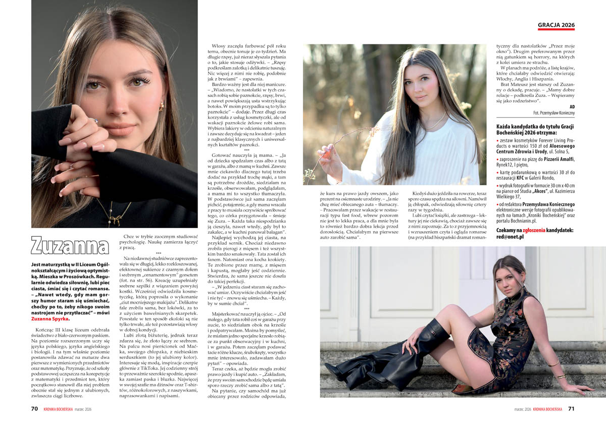 Jest maturzystką w II Liceum Ogólnokształcącym i życiową optymistką. Mieszka w Proszówkach. Regularnie odwiedza siłownię, lubi piec ciasta, śmiać się i czytać romanse. – „Nawet wtedy, gdy mam gorszy humor staram się uśmiechać, choćby po to, żeby nikogo swoim nastrojem nie przytłaczać” – mówi Zuzanna Spyrka, marcowa kandydatka do tytułu „Gracji Bocheńskiej 2026”.