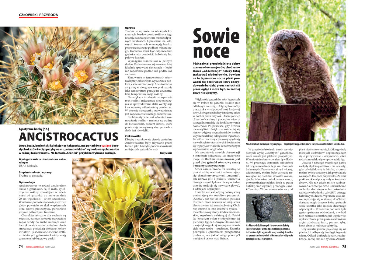 Czy w Bochni mieszkają sowy? – „Miasto zdominowane jest przez dwa gatunki: sowę uszatą i puszczyka zwyczajnego” – informuje Dominik Zwierniak i przypomina, że późna zima i przedwiośnie to dobry czas na obserwację sów. – „Przechadzka po lesie nocą, w ciszy, bez sztucznych świateł, z dala od hałasów i natłoku myśli jest ciekawym przeżyciem samym w sobie” – zachęca autor.