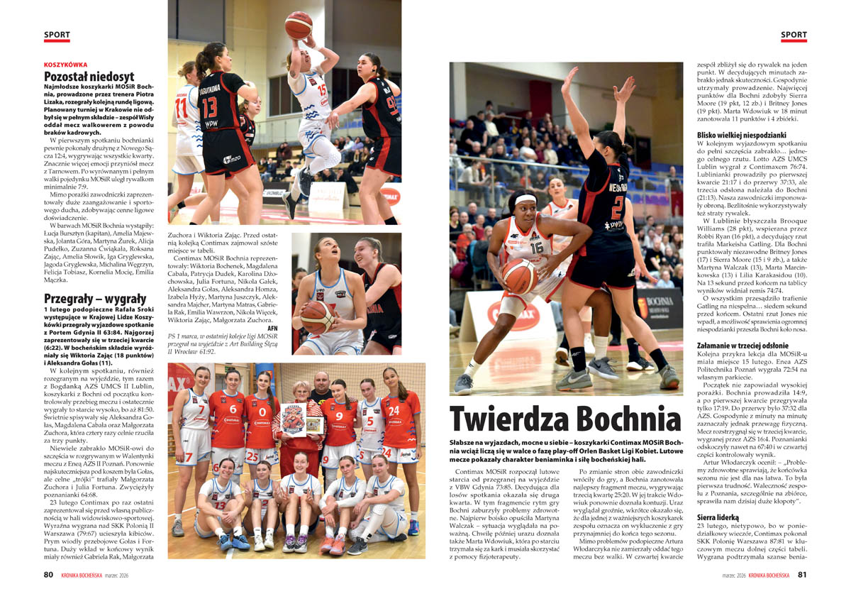 – „Słabsze na wyjazdach, mocne u siebie – ostatnie mecze pokazały charakter beniaminka i siłę bocheńskiej hali” – pisze Aleksandra Fortuna-Nieć w dziale sportowym. Nie brakuje relacji z innych rozgrywek, między innymi wyników judoków, piłkarzy ręcznych, piłkarzy nożnych, futsalistów czy rywalizujących w Krajowej Lidze Koszykówki podopiecznych Rafała Sroki.