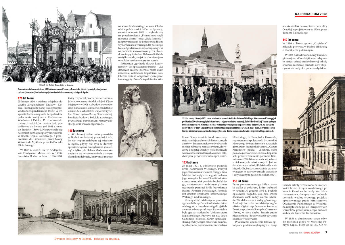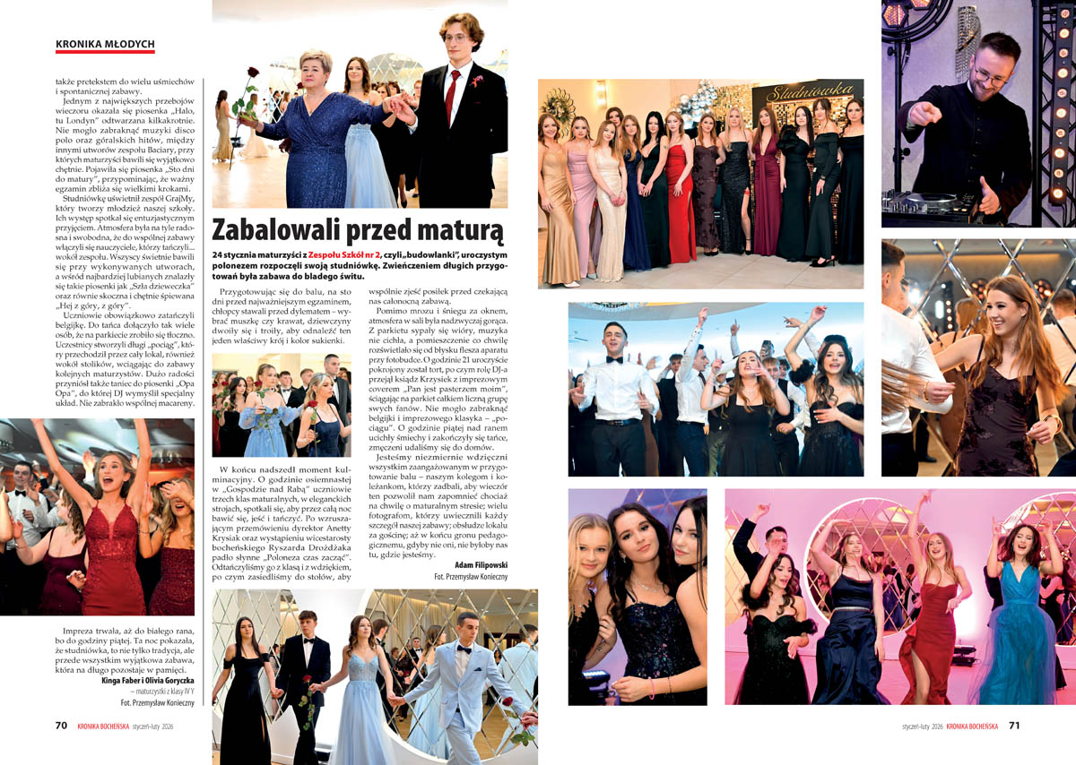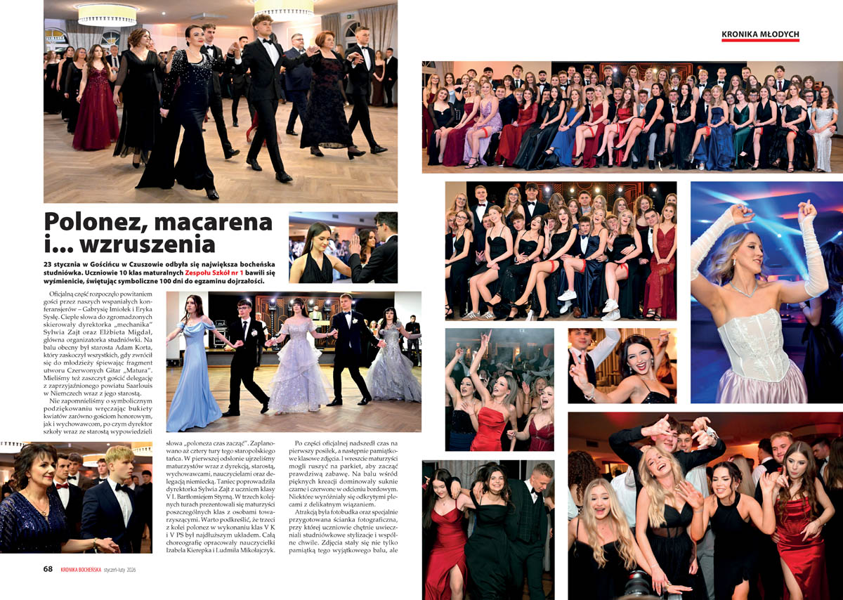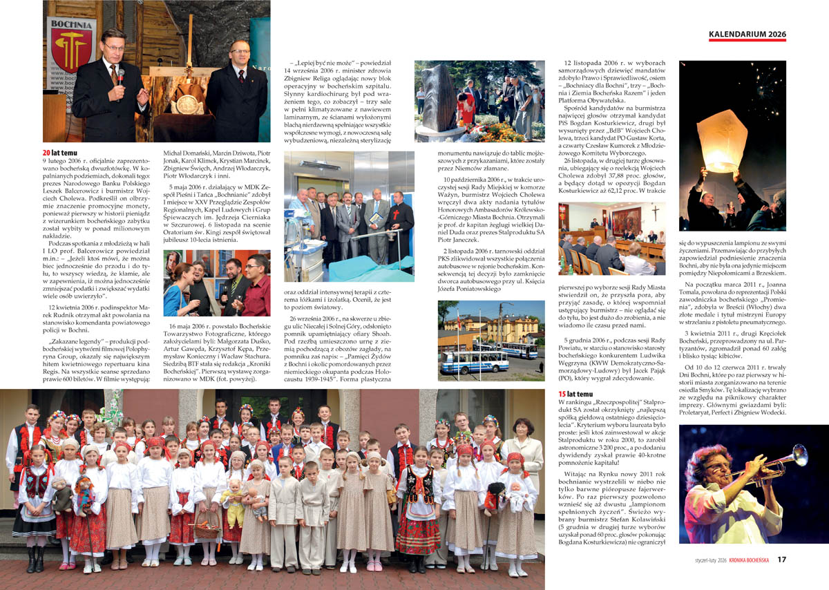 – „Wielokrotnie podkreślaliśmy, że publikowanie od 1997 roku naszych specyficznych kalendarzy ma na celu nie tylko prostą rejestrację faktów z przeszłości, lecz także nadawanie im nowych znaczeń w teraźniejszości” – tłumaczy redakcja we wstępie do Kalendarium 2026, które powstało w oparciu o zestawienia pozostawione przez zmarłego w 2023 roku Jana Flaszę i materiały własne. Samo kalendarium wydaje się wystarczającym powodem, by sięgnąć po noworoczny numer „Kroniki Bocheńskiej”. Ukontentowani będą jednak nie tylko miłośnicy historii, lecz także – jak zawsze – fani podróży, sportu i młodzież. W styczniowo-lutowym numerze (108 stron), którego okładkę zdobi zdjęcie „morsów” podczas charytatywnej akcji na rzecz WOŚP, można odnaleźć bogate w zdjęcia relacje ze studniówek oraz fotografie zbiorowe maturzystów I i II Liceum Ogólnokształcącego.