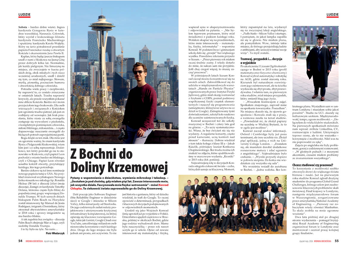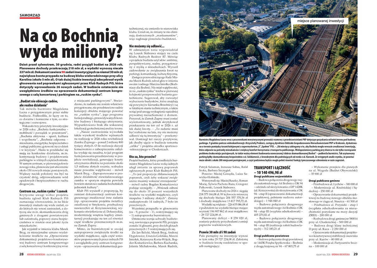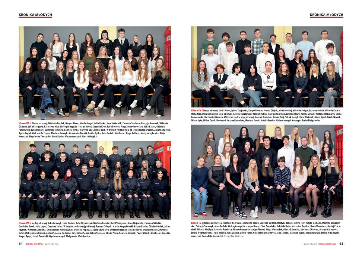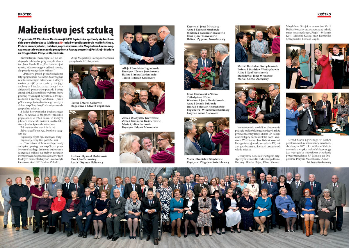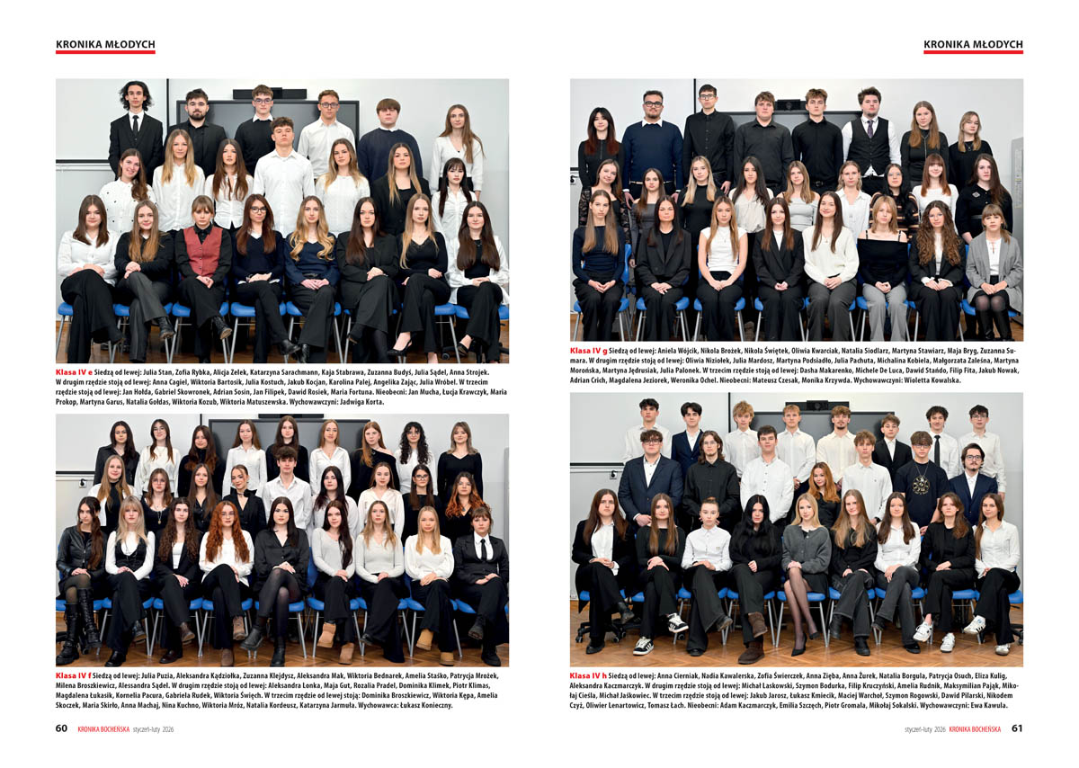 – „Wielokrotnie podkreślaliśmy, że publikowanie od 1997 roku naszych specyficznych kalendarzy ma na celu nie tylko prostą rejestrację faktów z przeszłości, lecz także nadawanie im nowych znaczeń w teraźniejszości” – tłumaczy redakcja we wstępie do Kalendarium 2026, które powstało w oparciu o zestawienia pozostawione przez zmarłego w 2023 roku Jana Flaszę i materiały własne. Samo kalendarium wydaje się wystarczającym powodem, by sięgnąć po noworoczny numer „Kroniki Bocheńskiej”. Ukontentowani będą jednak nie tylko miłośnicy historii, lecz także – jak zawsze – fani podróży, sportu i młodzież. W styczniowo-lutowym numerze (108 stron), którego okładkę zdobi zdjęcie „morsów” podczas charytatywnej akcji na rzecz WOŚP, można odnaleźć bogate w zdjęcia relacje ze studniówek oraz fotografie zbiorowe maturzystów I i II Liceum Ogólnokształcącego.