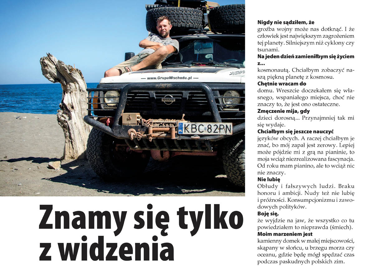 Bohaterem cyklu „Znamy się tylko z widzenia” jest Marcin Kozłowski. Od kilkunastu lat przemierza świat wraz z żoną Dominiką. Są autorami książki „Pod wiatr. 60 tysięcy kilometrów przez Afrykę” i artykułów, m.in. w „Kronice Bocheńskiej”.