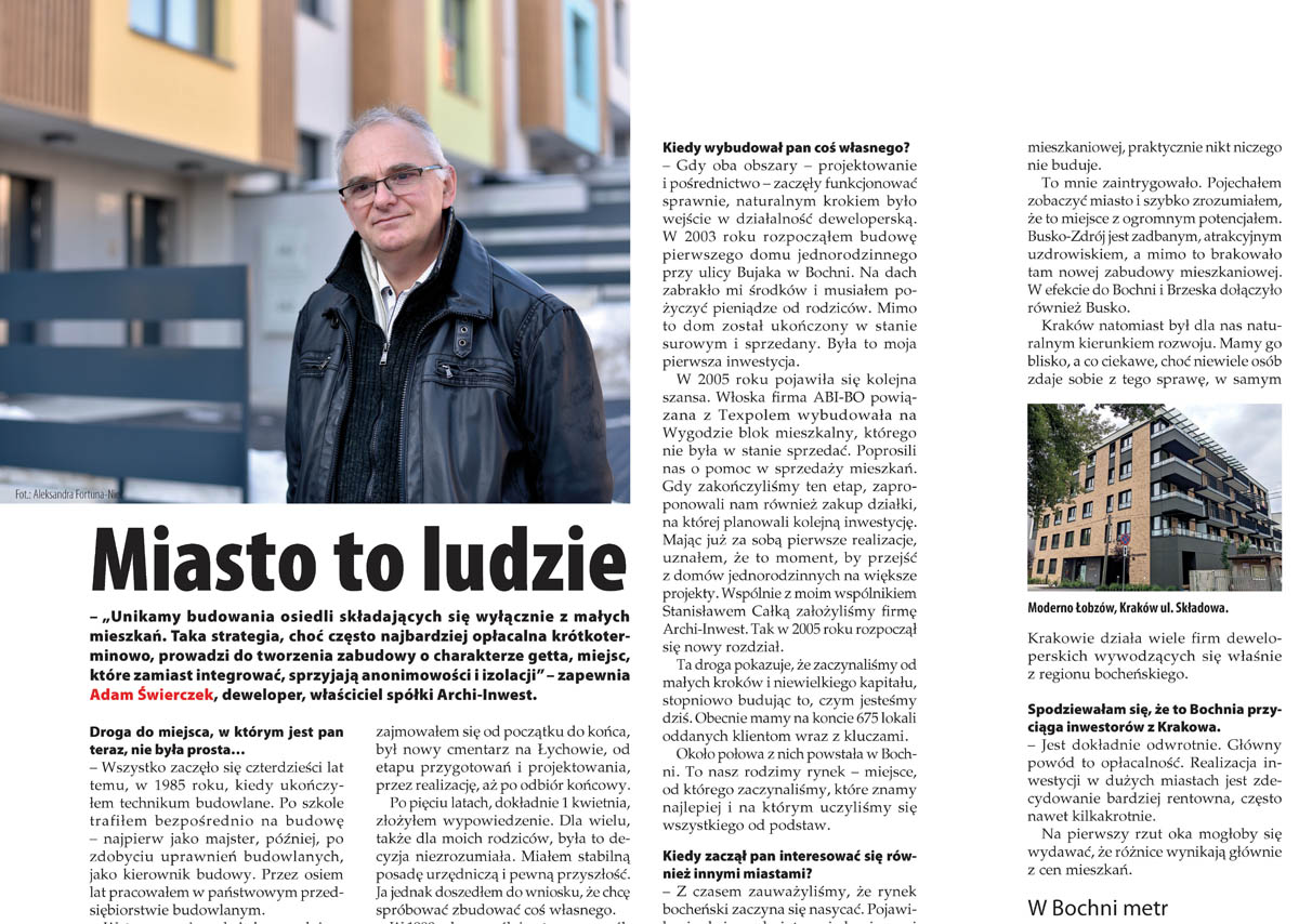– „Unikamy budowania osiedli składających się wyłącznie z małych mieszkań. Taka strategia, choć często najbardziej opłacalna krótkoterminowo, prowadzi do tworzenia zabudowy o charakterze getta, miejsc, które zamiast integrować, sprzyjają anonimowości i izolacji” – zapewnia Adam Świerczek, deweloper, właściciel spółki Archi-Inwest, w rozmowie z Aleksandrą Fortuną-Nieć.