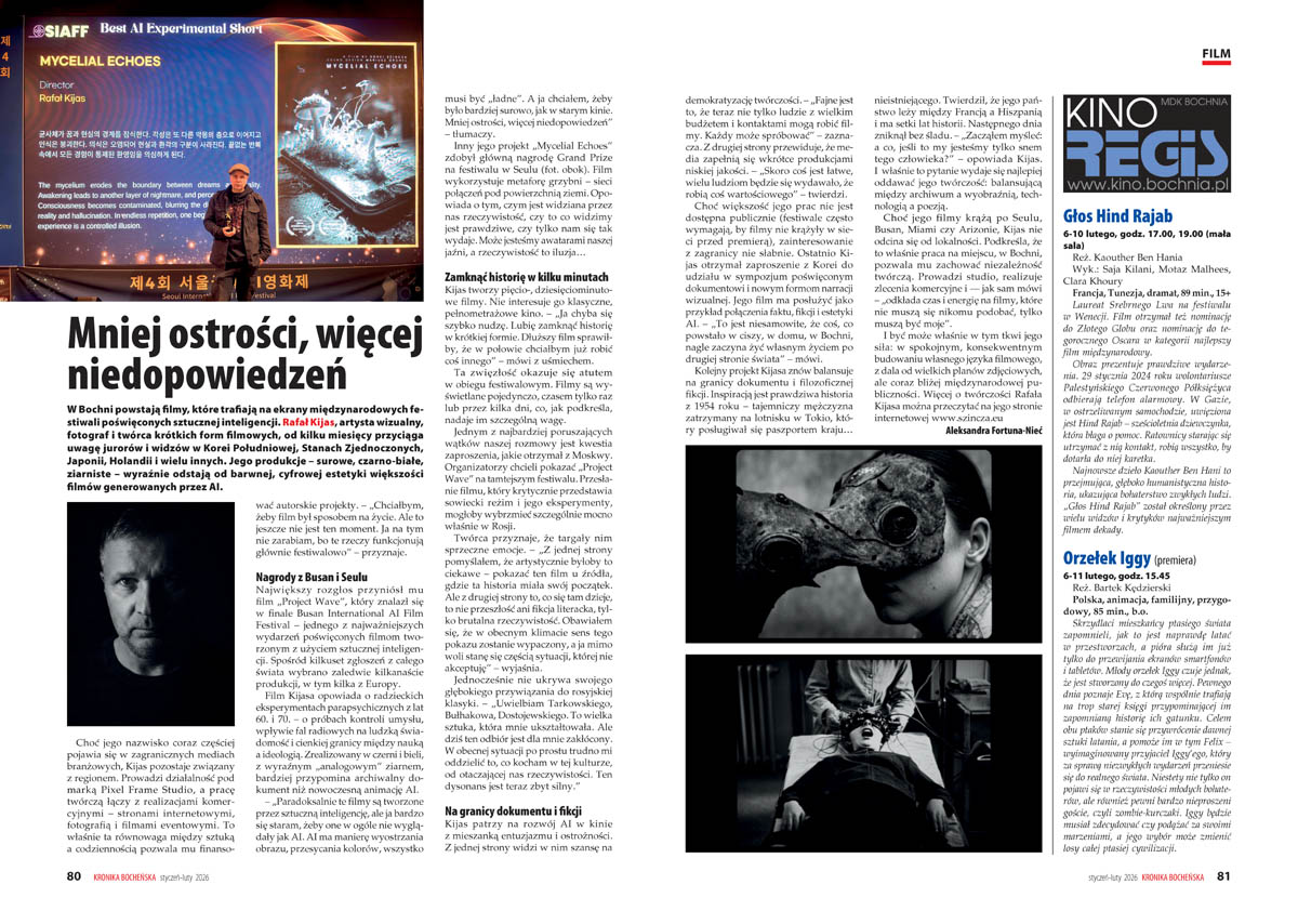 W Bochni powstają filmy, które trafiają na ekrany międzynarodowych festiwali poświęconych sztucznej inteligencji. Rafał Kijas, artysta wizualny, fotograf i twórca krótkich form filmowych, od kilku miesięcy przyciąga uwagę jurorów i widzów w Korei Południowej, Stanach Zjednoczonych, Japonii, Holandii i wielu innych krajach. Jego produkcje – surowe, czarno-białe, ziarniste – wyraźnie odstają od barwnej, cyfrowej estetyki większości filmów generowanych przez AI.