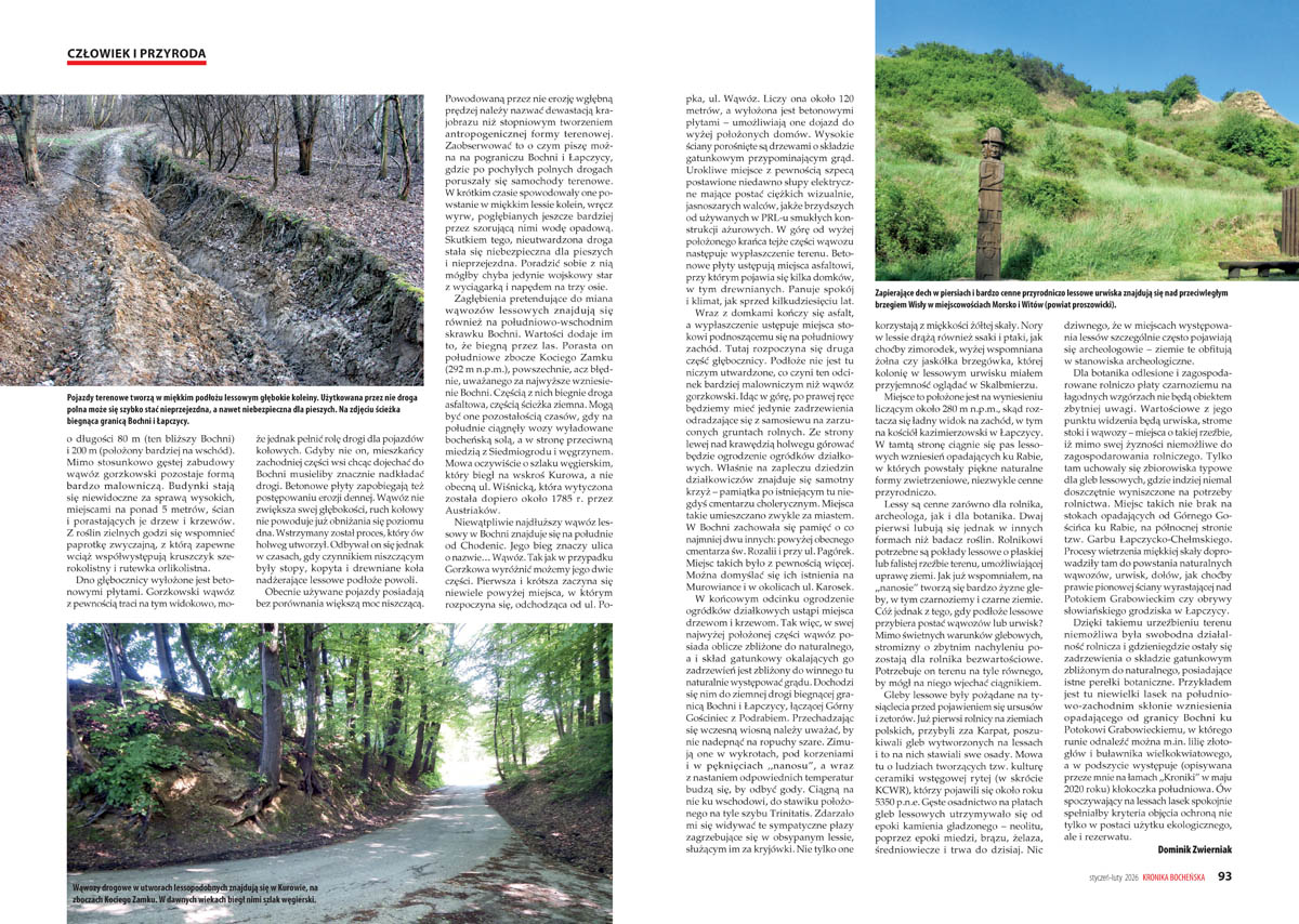 Gdzie znajduje się najdłuższy wąwóz lessowy w Bochni? Okazuje się, że na południe od Chodenic. Jego bieg wyznacza ulica o nazwie… Wąwóz. Wyróżnić można jego dwie części. Pierwsza i krótsza zaczyna się niewiele powyżej miejsca, w którym rozpoczyna się, odchodząca od ul. Popka, ul. Wąwóz. – „Lessy są cenne zarówno dla rolnika, archeologa, jak i dla botanika” – zauważa autor artykułu Dominik Zwierniak.