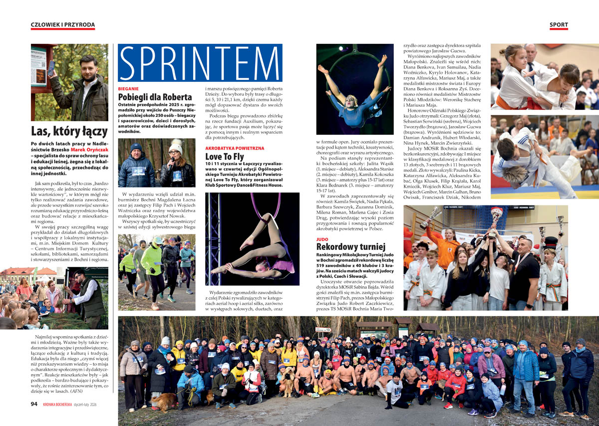 Sylwestrowy bieg poświęcony pamięci Roberta Dzieży, Turniej Akrobatyki Powietrznej Love to Fly czy Rankingowy Mikołajkowy Turniej Judo – to tylko niektóre z wydarzeń, o których można przeczytać w dziale „Sprintem”. Nie brakuje najnowszych informacji o postępach młodych piłkarzy ręcznych, nożnych i koszykarek ćwiczących pod okiem trenerów MOSiR Bochnia.